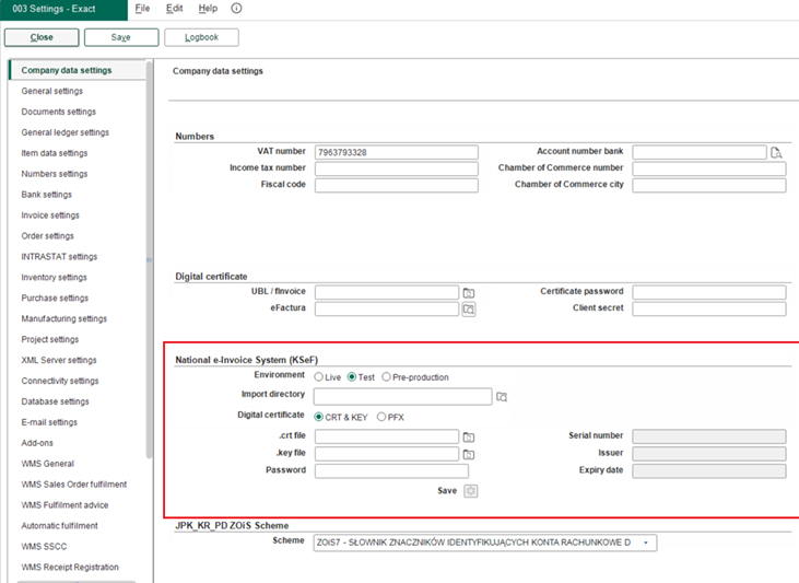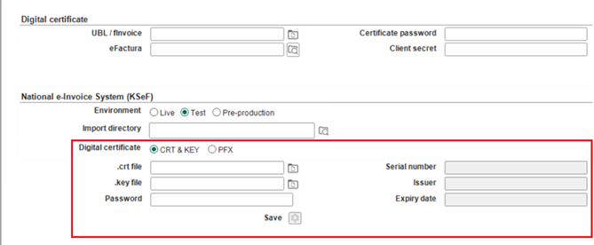 We have added the National e-Invoice System (KSeF) section at . In this section, you can choose to work with the live, test, or pre-production KSeF environment together with the settings for the KSeF reference and KSeF certificate.