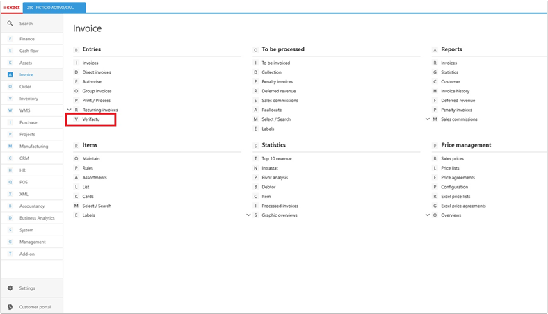 We have added the Verifactu Settings field under the VAT section at . This setting will display the Verifactu tab and also menu path under the Invoice module. Once selected, invoices can be sent in real time to AEAT when the invoices are final.