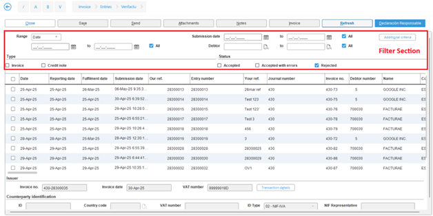 The Invoice > Entries > Verifactu screen displays the sales invoices and credit note transactions. This screen allows you to view, edit, and manage the details of the transactions. However, you can only update the transactions if the transactions have the Accepted with errors or Rejected status. You can resend the transactions with the Rejected status after you have updated the necessary information in the Extra information section.