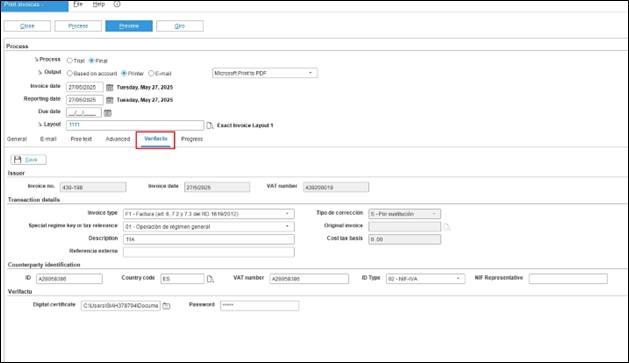 If you have selected the Verifactu checkbox in the Verifactu Settings fields at , the Verifactu tab will be displayed in the Print process screen at and . This tab allows you to review and update the Verifactu details before submission.