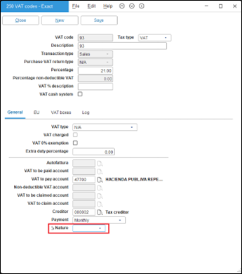 We have added the Nature field in the VAT codes screen. This field allows you to select the cause of tax exemption.