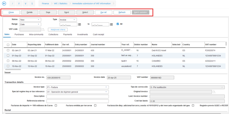 Only the Close, Our ref., and Refresh buttons will be enabled at if the Verifactu functionality is enabled.