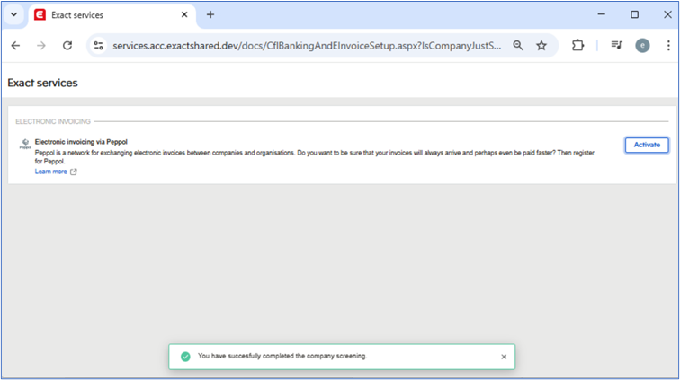 If you have completed all the steps correctly, the icon at Create Exact Shared Services account in the Electronic invoicing via Peppol section at System > General > Settings > Company data settings will be disabled.