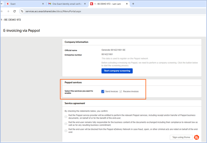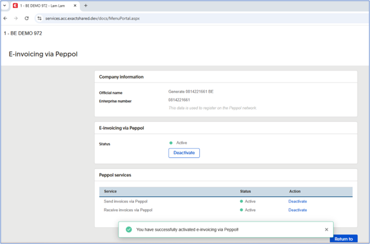 Note: For Belgian administrations that are using the existing Exact Shared Cloud Services connection and Dutch administrations, you can subscribe using another method and you are not required to activate the e-Invoice using PEPPOL.