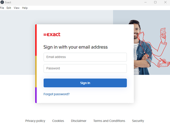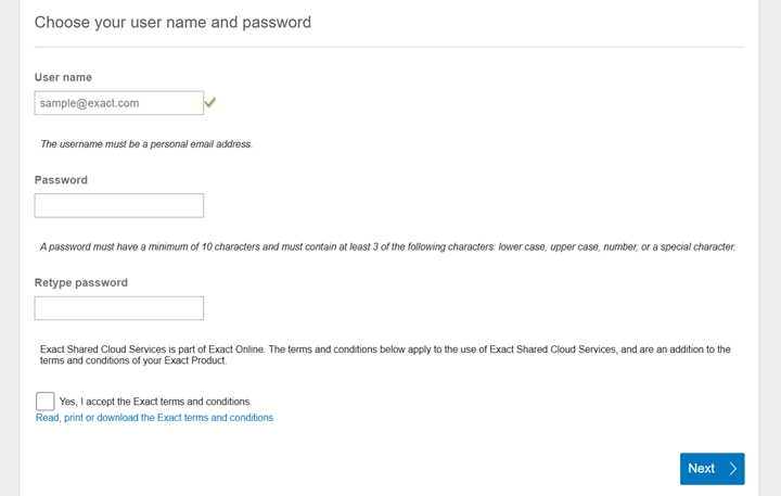 Enter your username (this is the same as your Exact Globe+ username in email format), password, and retype your password. Select the Yes, I accept the Exact terms and conditions checkbox.