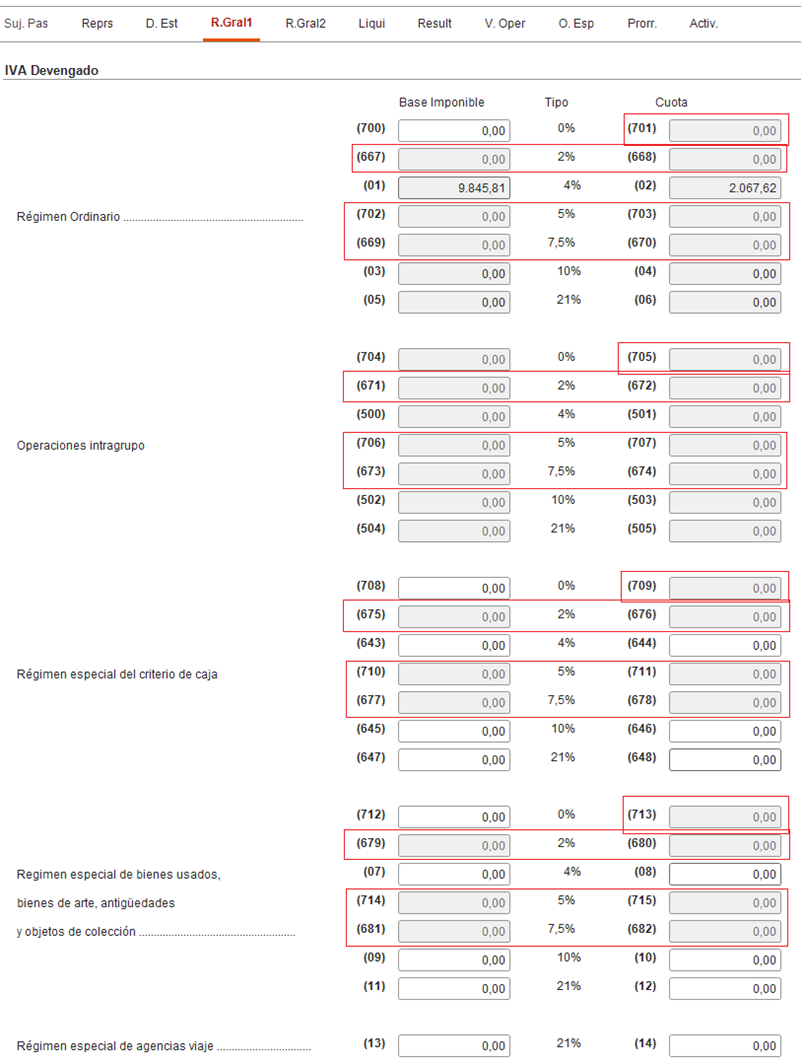 As of 1 January 2025, only the standard rate (21%), standard reduced rate (10%), super reduced rate (4%), and zero rate (0%) are applicable in Spain. Thus, some VAT boxes are disabled.