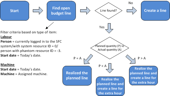 On this page, you can register the time entries for labor and machine hour items that have to be realized for the selected operation. The Start and Stop buttons on this page allow you to register the time spent on completing the operations. You can also access the overview of time registration from this page to view the statuses of the hour realizations for all operations.