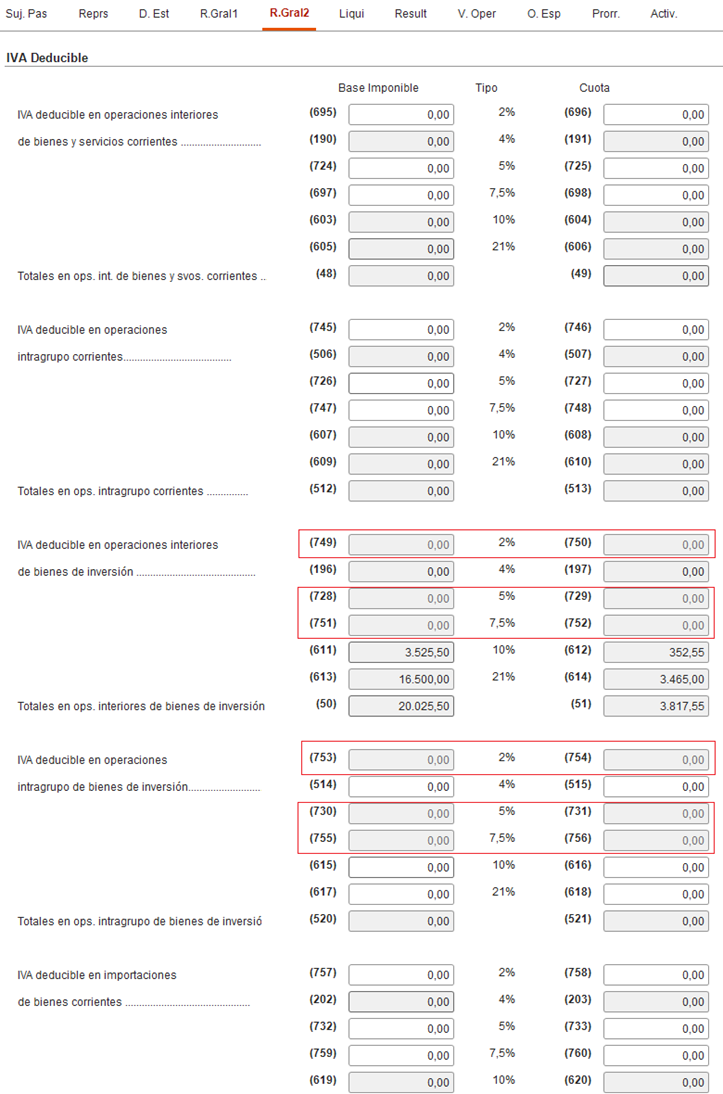 As of 1 January 2025, only the standard rate (21%), standard reduced rate (10%), super reduced rate (4%), and zero rate (0%) are applicable in Spain. Thus, some VAT boxes are disabled.