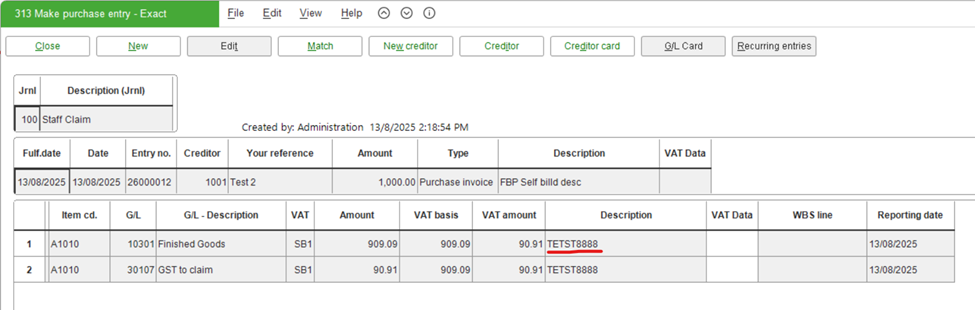 The LineDescription field is now available to help distinguish items with the same item code in self-billed entry lines. Normally, the user will use the standard item code and different line descriptions in the purchase journal for self-billed invoices. If the user decides to use the line description, the user can adjust the XSL for the invoice type code to a self-billed invoice.