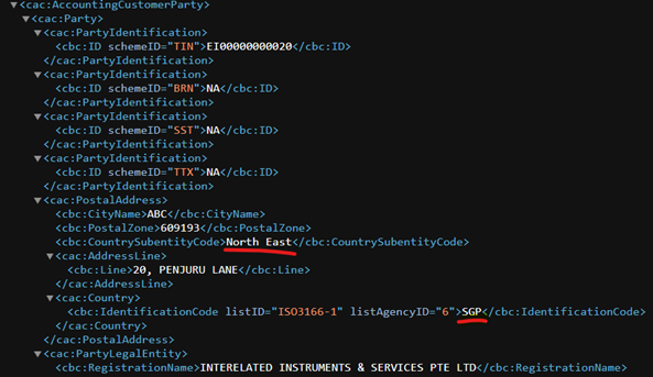 The following is a sample XML whereby the invoice debtor country is Singapore.