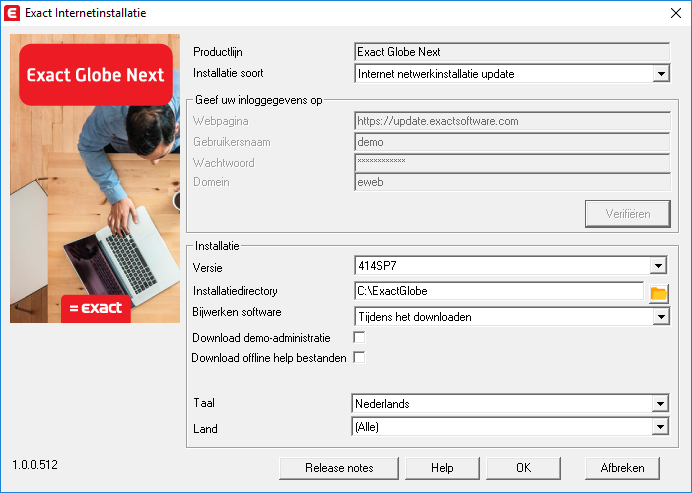 Hierbij zijn de volgende velden van toepassing: Productlijn Hier dient de naam van het product te worden in gegeven. Standaard zal daar de naam Exact Globe Next getoond worden, anders dient dit ingevoerd te worden. Het is ook mogelijk dat dit veld niet ingevuld kan worden. Installatiesoort Er zijn verschillende installatiesoorten. Elk installatiesoort wordt hieronder uitgelegd: Internet werkstationinstallatie - Deze keuze kiest u wanneer u een ‘stand-alone’ installatie wilt uitvoeren van Exact Globe Next op een werkstation via het internet. Internet netwerkinstallatie - Selecteer deze optie wanneer u Exact Globe Next via het internet wilt downloaden en installeren. Er wordt tevens een installatie set aangemaakt om een werkstationinstallatie te kunnen uitvoeren via de server. Internet netwerkinstallatie update - Selecteer deze optie wanneer u Exact Globe Next via het internet wilt updaten. LAN werkstationinstallatie - Heeft u Exact Globe Next via optie 2 of 8 geïnstalleerd, kunt u gebruik maken van de werkstationinstallatie set die op uw server is geïnstalleerd om een werkstationinstallatie te voltooien. LAN werkstationupdate - Wanneer u een internet of cd netwerkinstallatie update heeft uitgevoerd, kunt u gebruik maken van deze optie om de werkstations te updaten. DTAP werkstationinstallatie - Deze optie selecteert u wanneer u vanuit een DTAP (Development Test Acceptance Production) installatieset een werkstationinstallatie wilt uitvoeren. DTAP netwerkinstallatie - Deze optie selecteert u wanneer u vanuit een DTAP (Development Test Acceptance Production) installatieset een netwerkinstallatie wilt uitvoeren Aanmaken DTAP installatie - Met deze optie kunt u een DTAP (Development Test Acceptance Production) oftewel (Ontwikkeling Test Acceptatie Productie) installatieset aanmaken. Hiermee kunt u beschikken over een 'vaste' installatieset die u kunt gebruiken in een DTAP omgeving. Vanuit deze installatieset kunt u de DTAP werkstationinstallatie en DTAP netwerkinstallatie uitvoeren. De DTAP werkstationinstallatie kunt u starten door het bestand SetupDTAP_NL.exe in de map van de DTAP installatieset te starten, de DTAP netwerkinstallatie kunt u starten door het bestand NetSetupDTAP_NL.exe in de map van de DTAP installatieset te starten. De DTAP installatiemethode biedt u de mogelijkheid om dezelfde versie van de programmatuur te downloaden die u in verschillende omgevingen kunt gebruiken. Bijvoorbeeld een test en productie omgeving. Hiermee kunt u de laatste set van de programmatuur downloaden en installeren in uw testomgeving, waarna u de versie kunt evalueren en op basis van die resultaten de identieke versie in uw productie omgeving kunt installeren. CD werkstationinstallatie - Deze keuze kiest u wanneer u een ‘stand-alone’ installatie wilt uitvoeren op een werkstation via een cd-rom CD netwerkinstallatie - Selecteer deze optie wanneer u Exact Globe Next via een cd-rom installeren. Er wordt tevens een installatie set aangemaakt om een werkstationinstallatie te kunnen uitvoeren via de server. Sectie Geef uw inloggegevens op Webpagina Standaard verschijnt hier de pagina https://update.exactsoftware.com. Mocht deze niet ingevuld zijn, dan kunt u deze zelf invullen Gebruikersnaam Vul hier uw inlognaam welke u ook gebruikt voor de Customer Portal Wachtwoord Vul hier het wachtwoord in welke u gekregen heeft bij de gebruikersnaam Domein Vul hier de naam van het domein in. Dit betreft EWEB Verifiëren Klik op deze knop om de inloggegevens te verifiëren. Wanneer de verificatie niet succesvol, bijvoorbeeld wanneer u een onjuiste webpagina, gebruikersnaam of wachtwoord opgeeft, wordt een foutmelding getoond. Wanneer de verificatie succesvol is, wordt de sectie Geef uw inloggegevens op inactief, en wordt het veld Versie in de sectie Installatie automatisch ververst en toont de hoogste toegestane product of service pack die u mag downloaden. De sectie Installatie is alleen actief wanneer de verificatie succesvol is. Opmerking: Voor alle installatiesoorten m.u.v CD werkstationinstallatie en CD netwerkinstallatie, dient u de inloggegevens voor de customer portal op te geven. Sectie Installatie Versie Hier kunt u aangeven welke Product Update u wilt installeren. De hoogste toegestane product of service pack die u mag downloaden wordt automatisch getoond. Installatie directory Vul hier de directory in waarin Exact Globe Next geïnstalleerd is. Bijwerken software Wanneer u kiest voor 'tijdens het downloaden', dan zal de web services worden gestopt en worden alle nieuwe bestanden gedownload, vervolgens zal de web services weer worden gestart. De optie 'Na downloaden' zal ervoor zorgen dat eerst alle bestanden worden gedownload en vervolgens wordt de web services gestopt en worden de bestanden geïnstalleerd. Vervolgens zal de webservices weer worden gestart. Voor minder snelle internetverbindingen is dit een handige optie. Download demo-administratie Wanneer u een demo administratie wilt downloaden tijdens het uitvoeren van de update vinkt u deze optie aan. Download offline help bestanden Hier kunt u aanvinken of u de helpbestanden ook wilt downloaden. Deze helpbestanden bevat functionele informatie over de diverse functies in Exact Globe Next. Taal In dit veld kunt u aangeven in welke taal u de helpbestanden wilt downloaden. Op deze manier wordt veel onnodige downloadgrootte voorkomen. Land Met deze optie kunt u aangeven voor welk land u de bestanden (programmatuur) wilt downloaden. In bovenstaand voorbeeld kiest u bijvoorbeeld voor 'Nederland'. Vervolgens worden enkel de bestanden gedownload die voor een Nederlandse licentie van belang zijn en niet de bestanden bestemd voor bijvoorbeeld een Duitse licentie.
